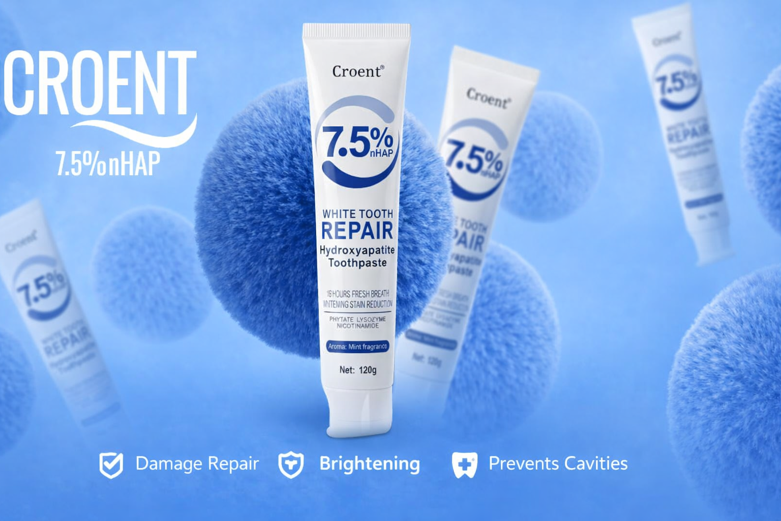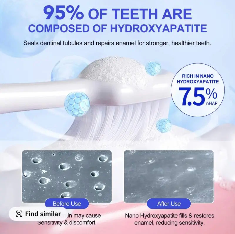 95% of your teeth are made of hydroxyapatite. Croent’s 7.5% Nano-Hydroxyapatite seals dentinal tubules, fills micro-damage, and restores enamel strength—helping reduce sensitivity and discomfort while supporting healthier, stronger teeth with every brush.